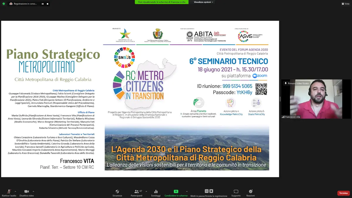 Ad animare il sesto seminario dal titolo “L’agenda 2030 e il Piano strategico della Città metropolitana di Reggio Calabria – L’alleanza delle visioni sostenibili per il territorio e le comunità in transizione”, sono stati la dott.ssa Anna Bombonato (Ministero della Transizione Ecologica), la dott.ssa Cinzia Crocè (Dipartimento Tutela dell’Ambiente della Regione Calabria), il pianificatore territoriale Francesco Vita (Ufficio Piano Strategico della Città Metropolitana), la professoressa Consuelo Nava (Responsabile Scientifica del progetto) e l’avvocato Giuseppe Marino (Consigliere Metropolitano Delegato alla Pianificazione).