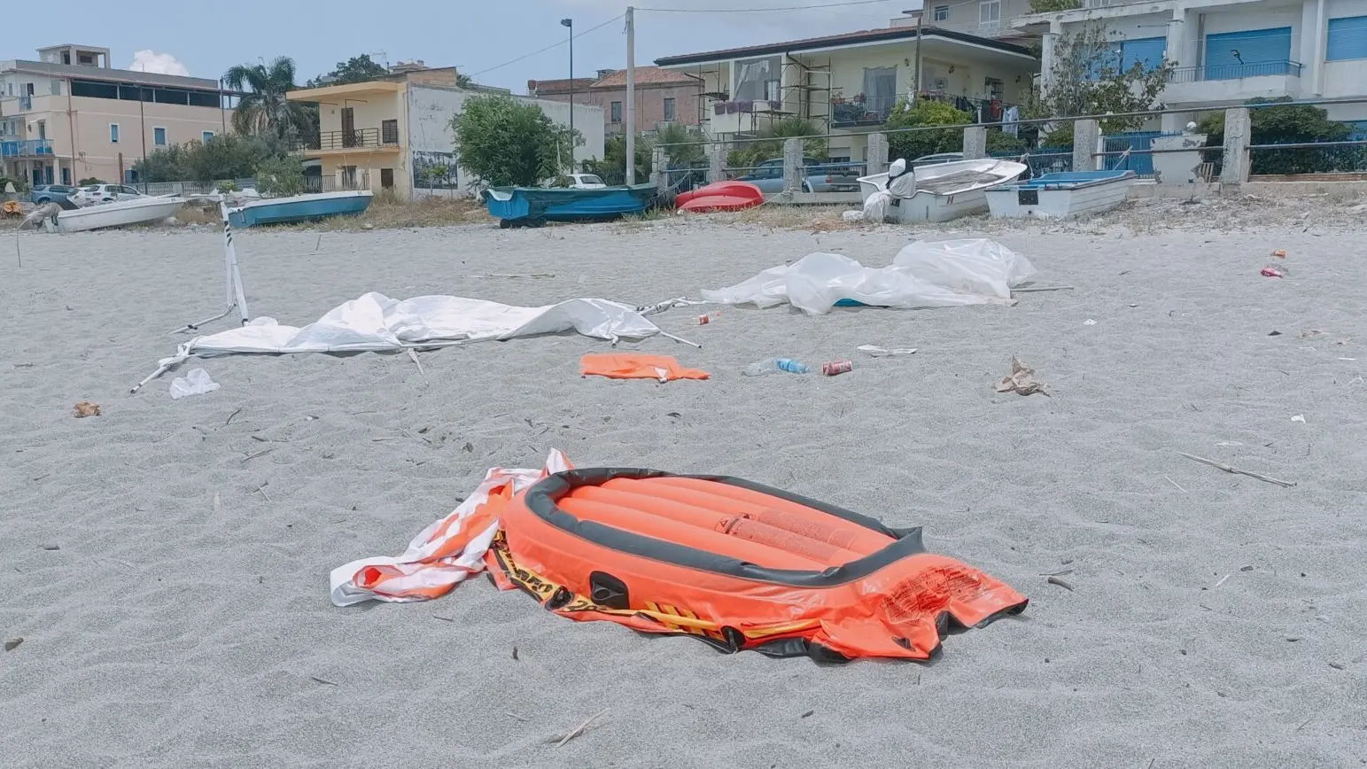 La spiaggia, per un lungo tratto, si ritrova invasa di rifiuti, resti di materassini gonfiabili ed altri oggetti abbandonati. Teli di plastica, resti di un possibile gazebo, carte da gioco, sacchetti vuoti di cornetti e bottiglie di plastica. A riva, quasi a mo’ di scultura, i resti di un banco di scuola arrugginito.