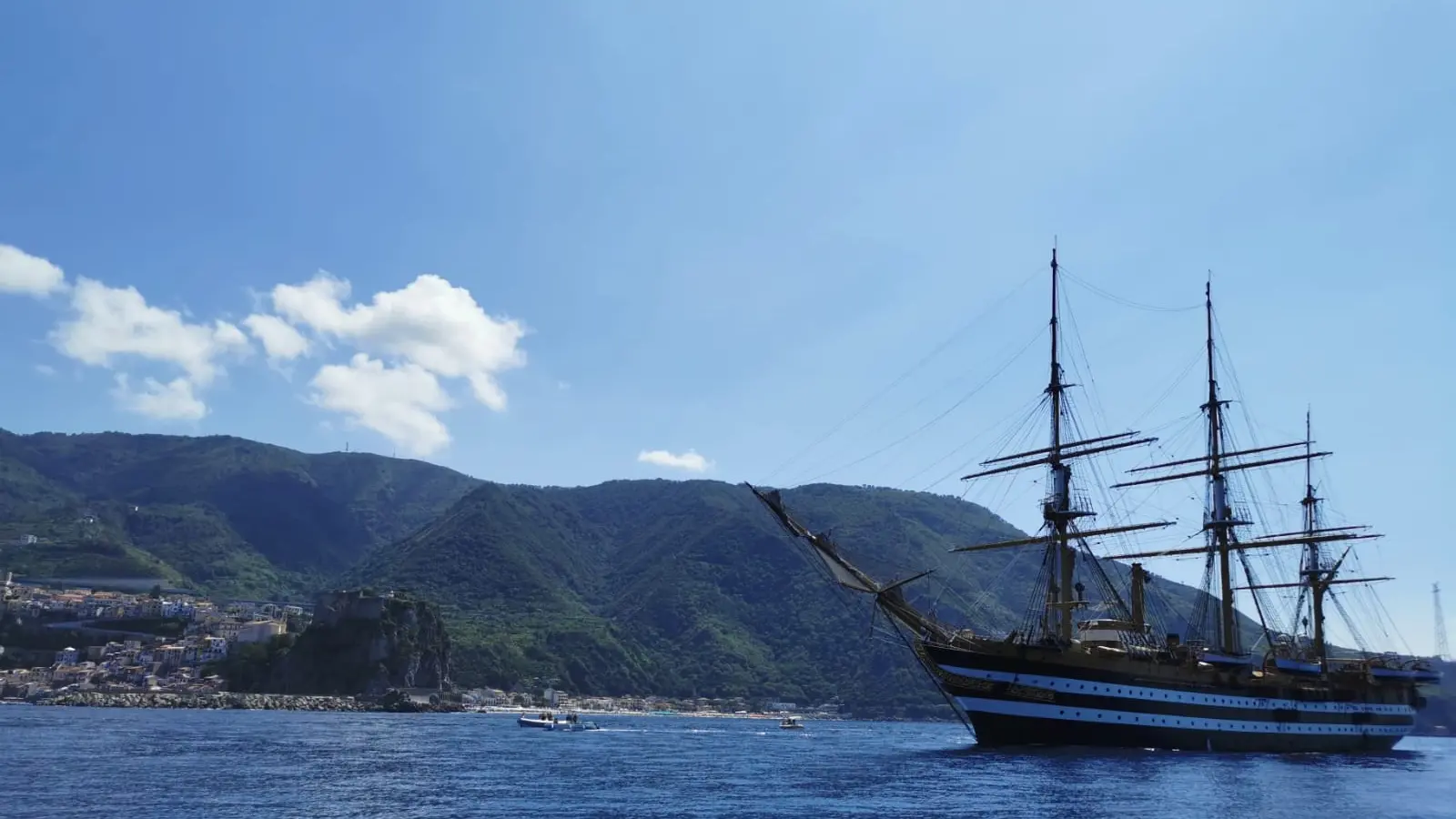 In un angolo di paradiso l’Amerigo Vespucci ha deciso di rallentare per godere dello spettacolo di Scilla e donare un momento di incanto. L’avvicinamento alla costa accompagnato dal saluto non è stato casuale.