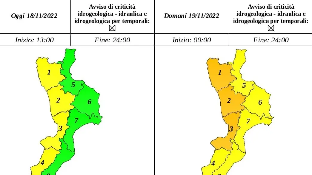La protezione civile regionale ha diramato un avviso di allerta meteo di colore “giallo” valido dalla mezzanotte di oggi alla mezzanotte di domani, sabato, 19 novembre per tutta l’area della provincia reggina.