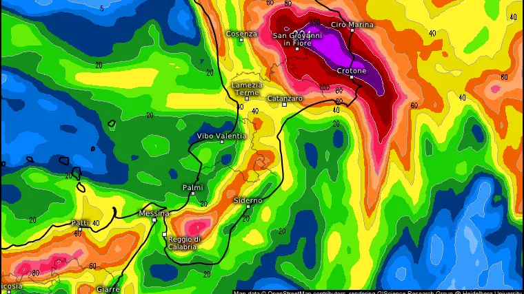 Secondo gli ultimi aggiornamenti le aree più a rischio di fenomeni intensi saranno quelle Joniche e in particolare del Reggino, Catanzarese e tra Crotonese e Cosentino con possibili temporali di forte intensità. Le precipitazioni risulteranno abbandonati anche nelle relative aree interne. Il vortice ciclonico richiamerà a sé anche aria fredda da Nord-est causando un generale calo della quota neve e con possibili nevicate a partire dai 1000 m di quota e accumuli molto abbondanti sulla Sila Greca.