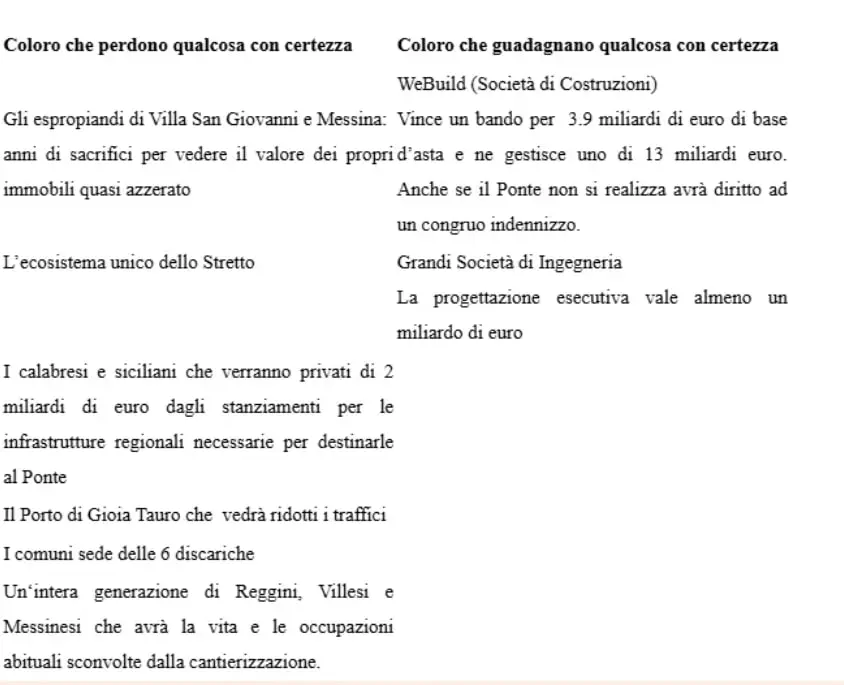 «Sì. Un secondo costo sociale non valutato è il costo esistenziale legato agli espropri che coinvolge almeno 450 famiglie fra Reggio e Messina. In relazione a questo costo, di difficile stima dal punto di vista esistenziale, non si può non notare che semplicemente pensando dimensione puramente monetaria della perdita di valore immobiliare degli immobili possiamo tranquillamente avere una stima di 100. 000. 000 di euro».