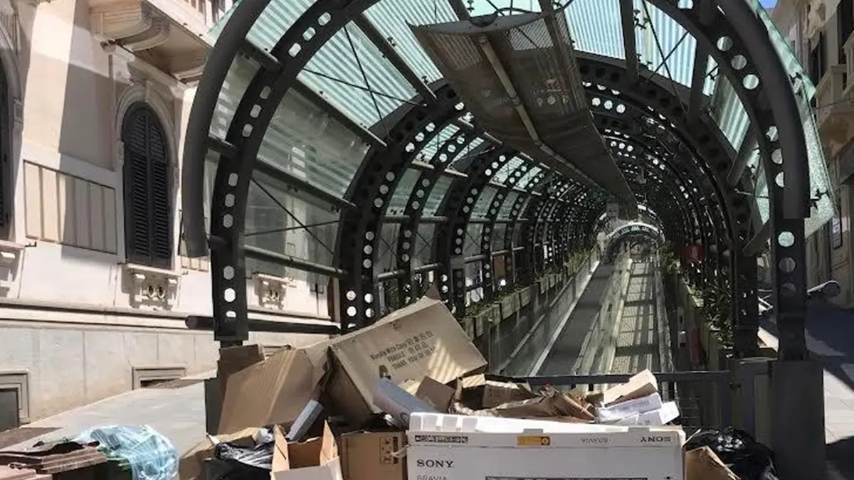 Ci sono biglietti da visita particolari. Luoghi che doppiamente rappresentano immagine di degrado e disagio. La fotografia scattata ieri al tapis roulant di Reggio Calabria è una di quelle. Tranquillizziamo il lettore intanto: stamattina presto, sul posto era presente la ditta di raccolta rifiuti che ha fatto ordine ed ha ripulito. Fortunatamente lo scempio è stato cancellato. Almeno per il momento, perché gli operatori ci hanno raccontato che ogni mattina, quel tratto del tapis, ossia la parte che c’è tra via Tripepi e corso Garibaldi (con vista sulla chiesa di San Giorgio, nds) è uno di quelli presi di mira per abbandonare rifiuti solidi di ogni genere.