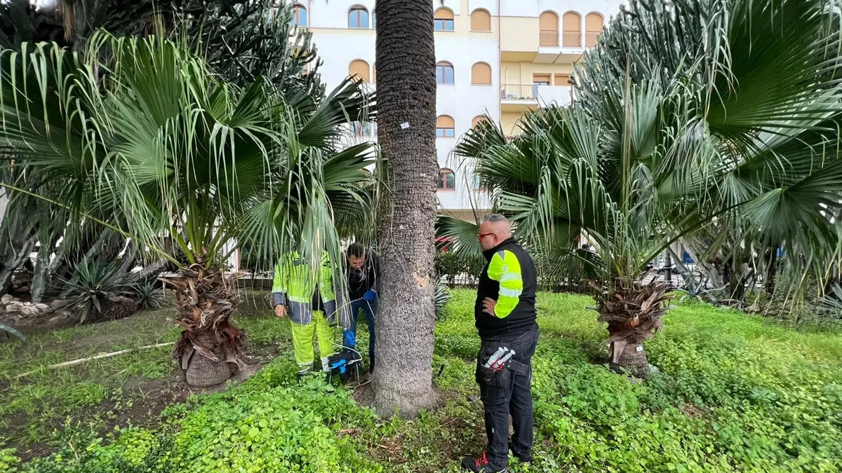 «Come amministrazione – ha spiegato il consigliere delegato Merenda – abbiamo lavorato in questi anni utilizzando i migliori prodotti presenti sul mercato per la tutela del nostro patrimonio arboreo di pregio, ed in particolare delle palme, largamente presenti sul Lungomare, realizzando un’efficace protezione dall’infestazione da punteruolo rosso. È stato fatto un grande lavoro, sebbene alcuni esemplari purtroppo siano stati compromessi, ma saranno prontamente rimpiazzati dalla piantumazione di nuove palme che abbiamo acquistato di recente. Già lo scorso anno i trattamenti sulle piante si erano concentrati su un’altra infezione, quella della processionaria, con risultati certamente apprezzabili ed un’attenzione specifica ai cortili delle scuole. Quest’anno continuiamo i trattamenti concentrandoci ulteriormente, con una tecnica simile, sul punteruolo rosso, con l’obiettivo di tutelare e valorizzare al meglio il vasto patrimonio botanico di pregio che insiste sul nostro Lungomare ed in altre aree verdi del territorio comunale».