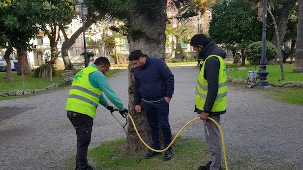 Dopo le operazioni sul Lungomare Falcomatà dei giorni scorsi, questa mattina è stata la volta della Villa Comunale di Reggio Calabria. Sono stati eseguiti trattamenti al terreno, effettuati con pali iniettori gestiti da apposite macchine distributrici, che consentono di diminuire gli stress fisiologici, facilitando il recupero delle piante e migliorando la distribuzione delle radici. L’obiettivo è quello di pervenire a un migliore assorbimento degli elementi nutritivi per difendere meglio le piante dagli attacchi di agenti patogeni.
