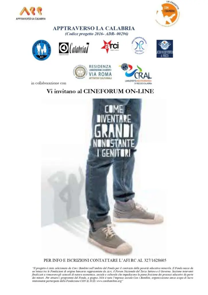 Al progetto ha contribuito Calabria 7 soc. coop. sociale, partner della rete che, in periodo di emergenza covid -19, ha messo a disposizione tablet di sua proprietà. La consegna dei tablet in comodato gratuito a ciascuno studente, grazie alla collaborazione della Croce Rossa Vallata del Gallico, è stata utile per la prosecuzione del progetto, si è rivelata una risorsa assolutamente necessaria anche per dare la possibilità agli studenti coinvolti di seguire la didattica a distanza attivata dal Nostro Repaci sulla piattaforma d’Istituto e ha rappresentato un apporto tangibile e concreto di intervento mirato all’integrazione e all’inclusione, perché nessuno nella scuola resti indietro. E ora questa nuova iniziativa rivolta ai genitori, un Cineforum on line per parlare di adolescenza e di famiglia; prima del 24 giugno sarà opportuno che i genitori, possibilmente insieme ai figli adolescenti, guardino il film “Come diventare grandi nonostante i genitori”, una commedia bella e coinvolgente, – disponibile su youtube. Per info e iscrizioni contattare l’AFI -Associazione delle Famiglie RC 327/1628605.