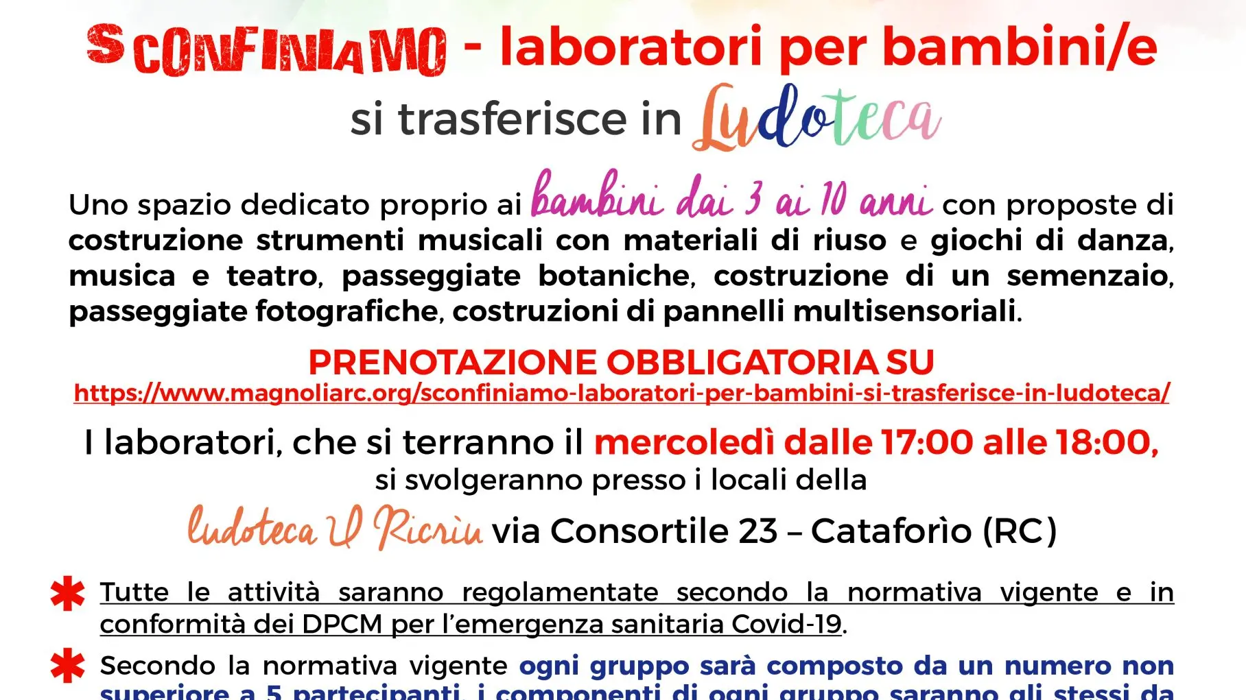 I laboratori, che sono già stati attivati, si terranno ogni mercoledì dalle 17 alle 18 e si svolgeranno presso i locali della ludoteca U Ricrìu via Consortile 23 – Cataforìo (RC). Ci sono ancora posti disponibili ed il prossimo appuntamento sarà mercoledì 10 giugno! Prenotazione obbligatoria su https://www.magnoliarc.org/sconfiniamo-laboratori-per-bambini-si-trasferisce-in-ludoteca/