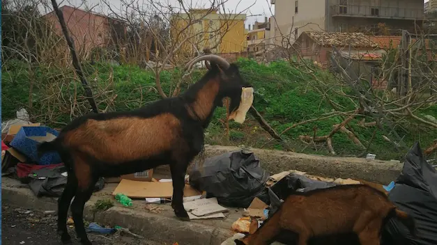Capre al “pascolo” in mezzo all’immondizia. Non siamo in una strada di campagna o in una strada isolata, ma ci troviamo a pochi passi dal centro cittadino. Come ci segnala una lettrice, si tratta di una delle “bretelle” del Calopinace che costeggia il Cedir. Da qualche tempo a questa parte non è uno spettacolo inconsueto vedere questi animali circolare liberamente e mangiare, al posto dell’erba, i rifiuti che cittadini incivili abbandonano.