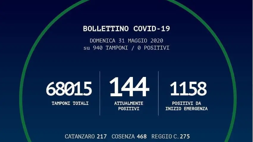 - Reggio Calabria: 20 in isolamento domiciliare; 236 guariti; 19 deceduti.