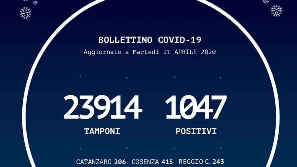 In Calabria ad oggi sono stati effettuati 23.914 tamponi. Le persone risultate positive al Coronavirus sono 1.047 (+9 rispetto a ieri), quelle negative sono 22.867. Territorialmente, i casi positivi sono così distribuiti:
