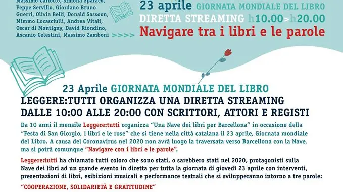 Sarà un appuntamento imperdibile quello di giovedì 23 aprile: una diretta streaming da tutta Italia in occasione della Giornata mondiale del libro con autori, scrittori, artisti e musicisti rappresentativi della scena nazionale. Nomi come Massimo Carlotto, Ascanio Celestini, Maurizio de Giovanni, Grazia di Michele, Mimmo Locasciulli, Melania Mazzucco, David Riondino, Peppe Servillo, Andrea Vitali, Massimo Zamboni e tantissimi altri si alterneranno sul palcoscenico virtuale dell’evento, realizzato dalla rivista letteraria Leggere: tutti che ormai da 10 anni organizza “Una Nave dei libri per Barcellona”.