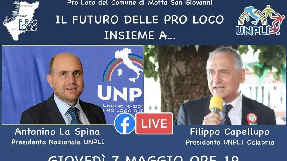 In diretta sulla pagina Facebook della Pro Loco del Comune di Motta San Giovanni, Giovedì 7 Maggio alle ore 19.00, si parlerà del futuro delle Pro Loco e della ripresa delle loro attività in seguito alla difficile situazione di emergenza Covid-19.