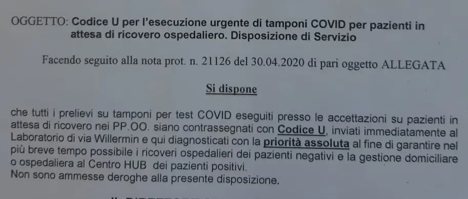 Con il provvedimento si dispone che i pazienti in attesa di ricovero ospedaliero, fermo restando il percorso Covid e la loro provvisoria osservazione protetta in Astanteria, eseguano il tampone di pre-ospedalizzazione con invio immediato dello stesso in codice U, il codice che indica la priorità assoluta per l’esecuzione dei tamponi urgenti. «Tale attivazione – si legge – consentirà di ridurre l’attesa dei pazienti in ricovero e il rischio clinico epidemiologico dei pazienti sospetti in ambito domiciliare».
