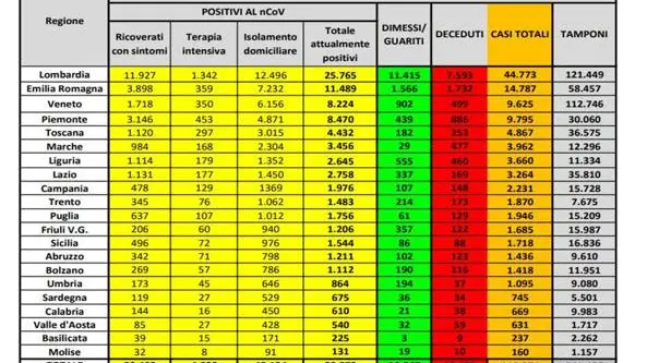 In Italia, dall’inizio dell’epidemia di Coronavirus, 110.574 casi persone hanno contratto il virus Sars-CoV-2 (4.782 persone in più rispetto a ieri per una crescita del 4,5%) . Di queste, 13.155 sono decedute 727 (+5,8%) e 16.847 sono guarite. Attualmente i soggetti positivi sono 80.572 (il conto sale a 110.574 — come detto sopra — se nel computo ci sono anche i morti e i guariti, conteggiando cioè tutte le persone che sono state trovate positive al virus dall’inizio dell’epidemia). I dati sono stati forniti dalla Protezione civile.