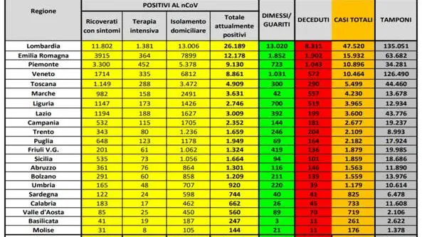 In Italia, dall’inizio dell’epidemia di Coronavirus, 119.827 persone hanno contratto il virus Sars-CoV-2 (4.585 persone in più rispetto a ieri per una crescita del 4+%) . Di queste, 14.681 sono decedute (+766, +5,5%) e 19.758 sono guarite (+1480, +8,1%). Attualmente i soggetti positivi sono 85.388 (+2339 e +2,8%. Il conto sale a 119.827 — come detto sopra — se nel computo ci sono anche i morti e i guariti, conteggiando cioè tutte le persone che sono state trovate positive al virus dall’inizio dell’epidemia). I dati sono stati forniti dalla Protezione civile.