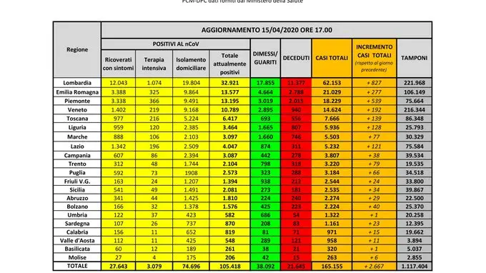 I guariti raggiungono quota 38.092, per un aumento in 24 ore di 962 unità (ieri erano state dichiarate guarite 1695 persone).