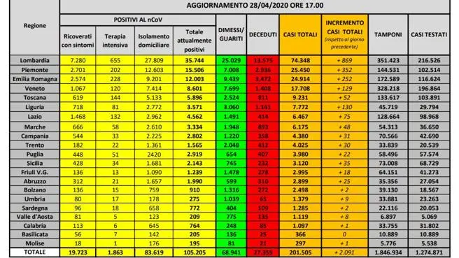 In Italia, dall’inizio dell’epidemia di Coronavirus, almeno 201.505 persone hanno contratto il virus Sars-CoV-2 (2.100 in più rispetto a ieri, per una crescita dell’1.1%; ieri +1.730). Di queste, 27.359 sono decedute (+382, +1.4%; ieri +333) e 68.941 (+2.317, +3.5%; ieri +1.696) sono state dimesse. Attualmente i soggetti positivi dei quali si ha certezza sono 105.205 (il conto sale a 201.505 — come detto sopra — se nel computo ci sono anche i morti e i guariti, conteggiando cioè tutte le persone che sono state trovate positive al virus dall’inizio dell’epidemia). I dati sono stati forniti dalla Protezione civile. I pazienti ricoverati con sintomi sono 19.723; 1.863 (-93, -4.8%; ieri -53) sono in terapia intensiva.