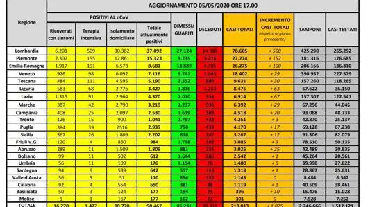 In Italia, dall’inizio dell’epidemia di Coronavirus, almeno 213.013 persone hanno contratto il virus Sars-CoV-2 (1.075 in più rispetto a ieri, per una crescita dello 0.5%; ieri +1.221). Di queste, 29.315 sono decedute (+236, +0.8%; ieri +195) e 85.231 (+2.352, +2.8%; ieri +1.225) sono state dimesse. Attualmente i soggetti positivi dei quali si ha certezza sono 98.467 (il conto sale a 213.013 — come detto sopra — se nel computo ci sono anche i morti e i guariti, conteggiando cioè tutte le persone che sono state trovate positive al virus dall’inizio dell’epidemia). I dati sono stati forniti dalla Protezione civile. I pazienti ricoverati con sintomi sono 16.270; 1.427 (-52, -3.5%; ieri -22) sono in terapia intensiva.