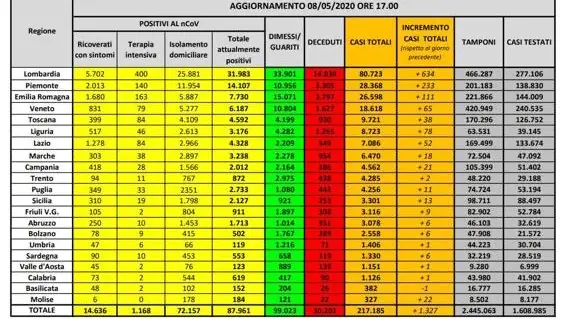 Lombardia 80.723 (+634, +0,8%; ieri erano stati +720)