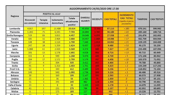 Lombardia 87.110 (+285, +0,3%; ieri +441)