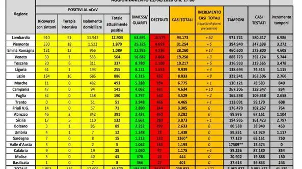 Lombardia 93.173 (+62, +0,1%; ieri +143)