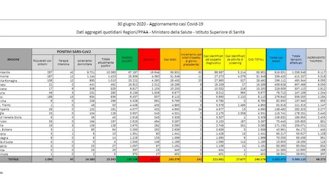In Italia, dall’inizio dell’epidemia di coronavirus, almeno 240.578 persone hanno contratto il virus Sars-CoV-2 (+142, +0,1%; ieri +126). Di queste, 34.767 sono decedute (+23, +0.1%; ieri +6) e 190.248 sono state dimesse (+1.052, +0,6%; ieri +305). Attualmente i soggetti positivi dei quali si ha certezza sono 15.563 (-933, -5,7%; ieri -185: il conto sale a 240.578 — come detto sopra — se nel computo ci sono anche i morti e i guariti, conteggiando cioè tutte le persone che sono state trovate positive al virus dall’inizio dell’epidemia).