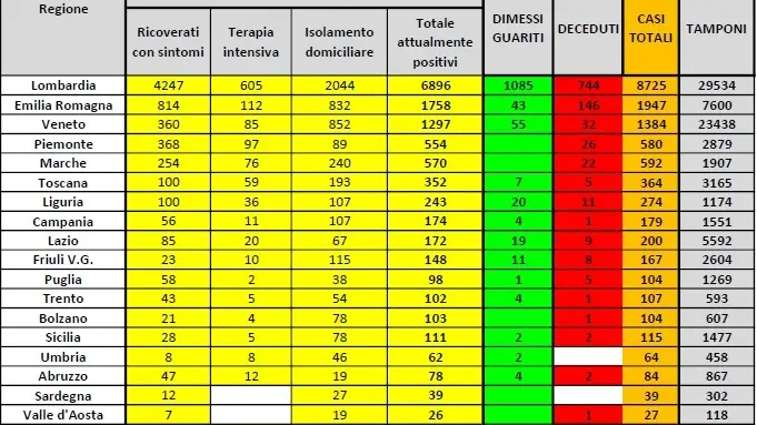 La Protezione civile ha diramato il bollettino legato ai casi di coronavirus in Italia. I contagi complessivi sono adesso 15.113, dei quali 1.258 sono guariti e 1.016 sono deceduti. In questo momento le persone positive al coronavirus in Italia sono 12.839. Rispetto a ieri, i contagi sono aumentati di 2.249 persone; i guariti sono cresciuti di 213 unità; i deceduti di 188. Sono 1.153 i malati in terapia intensiva, 125 in più rispetto a ieri.