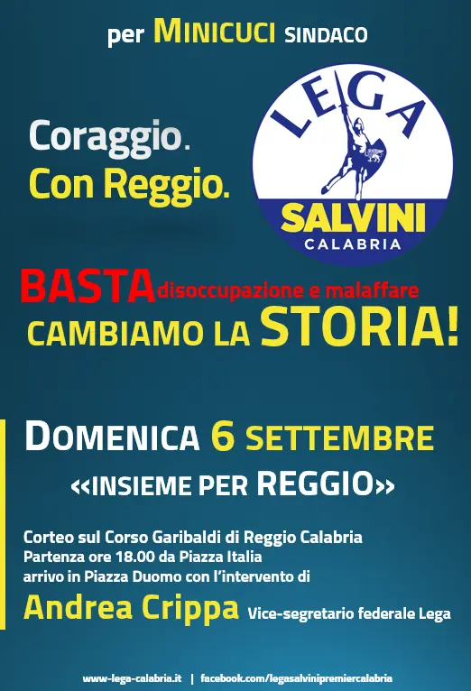 L’interesse della Lega per Reggio è reso evidente dalla determinazione con la quale ha lottato per esprimere il candidato sindaco e dalla presenza costante dello stesso Salvini sul territorio. Lo scorso 24 agosto è stato sul lungomare, insieme alla governatrice Jole Santelli e alla coordinatrice regionale di Fdi Wanda Ferro, per aprire ufficialmente la campagna elettorale di Antonino Minicuci, il super tecnico che dovrebbe salvare il Comune dalle difficili acque in cui naviga. E adesso, come annunciato dalla pagina facebook della Lega Calabria, è pronto ad inviare il suo vice Andrea Crippa. Per domenica 6 settembre è fissata la manifestazione “Insieme per Reggio” che chiamerà a raccolta deputati e consiglieri regionali per sostenere la corsa di Minicuci. “Basta disoccupazione e malaffare, cambiamo la storia!”, lo slogan che campeggia sul volantino di annuncio della manifestazione pubblicato anche sulla pagina facebook della Lega Calabria.
