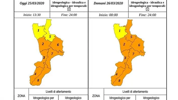 In particolare allerta arancione, con forti temporali, riguarderà tutta la Calabria, fino alla mezzanotte di domani.