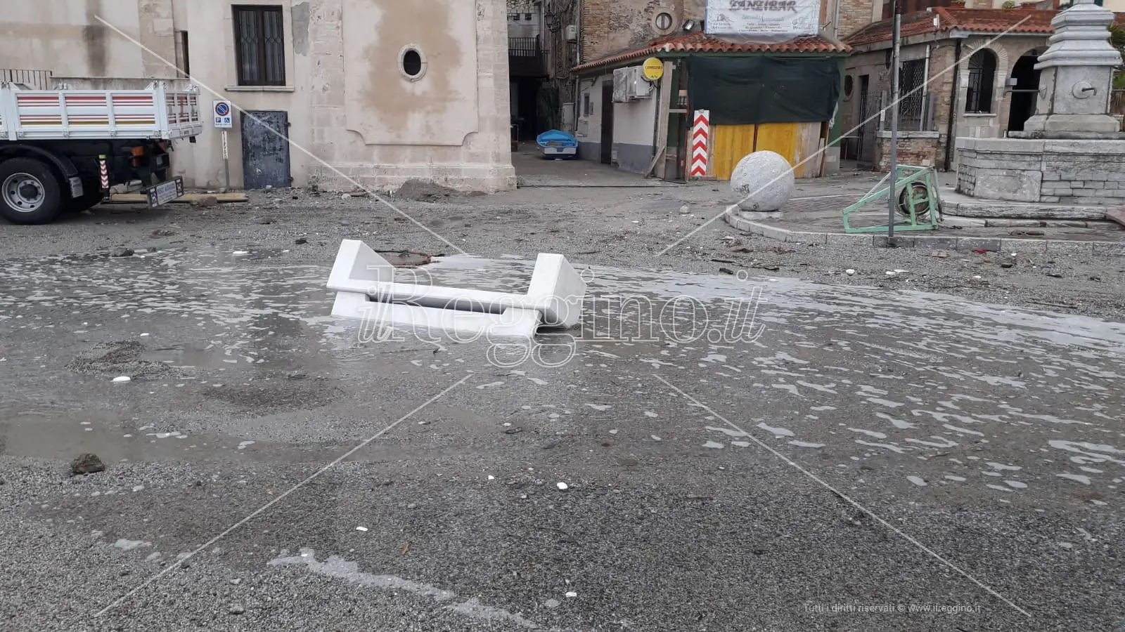 I primi danni sono già evidenti, come già accaduto due volte in questo inverno, la forza del mare ha divelto panchine e fioriere trasportandole in strada insieme a grandi quantitativi di sabbia.