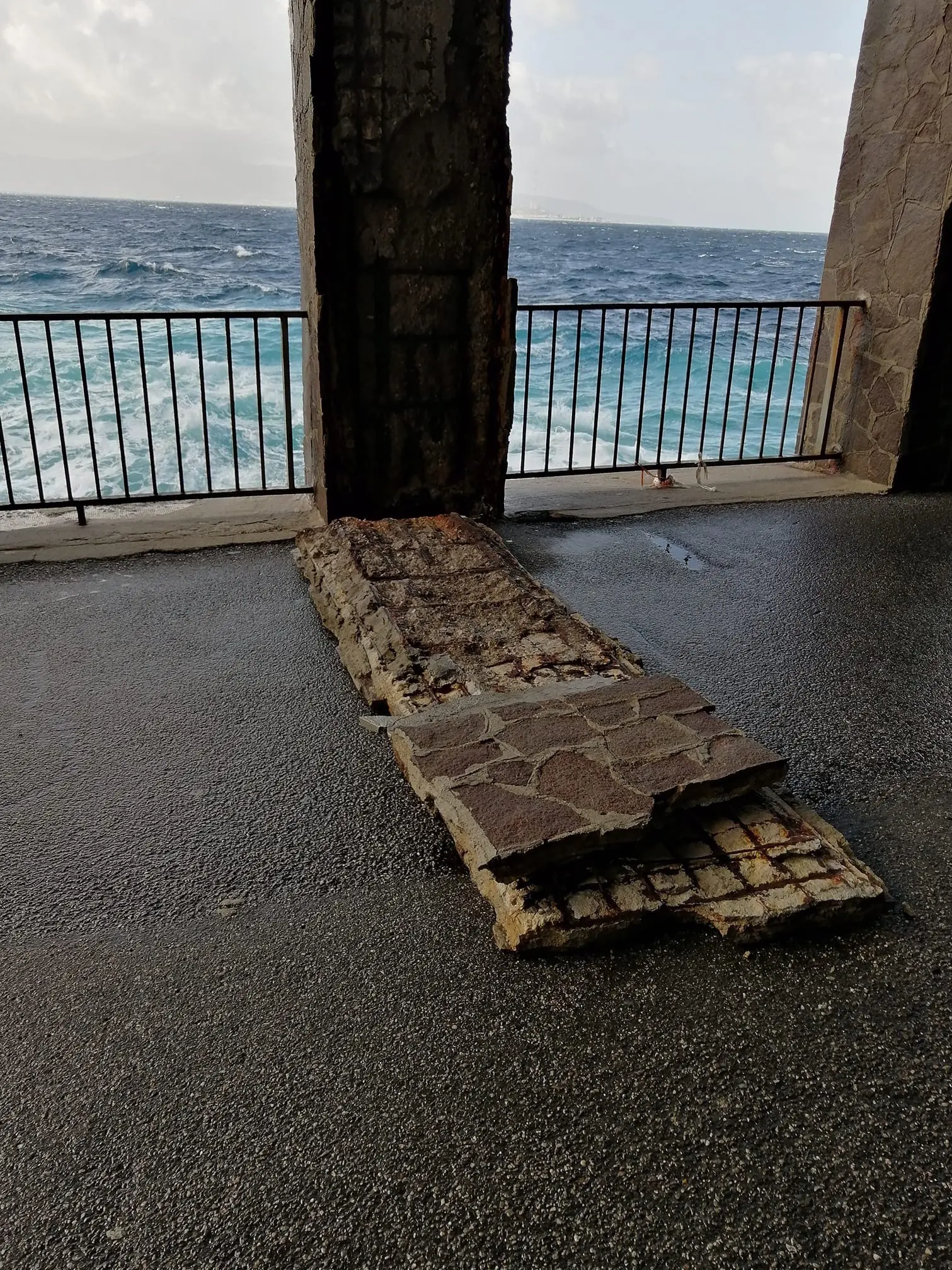 Interi pilastri sono crollati e l’intera struttura, messa provvisoriamente in sicurezza con nastri e sbarre, adesso è nuovamente in balia del mare. Tutto è stato spazzato via. Le barriere di protezione sono state trascinate via e i nastri spezzati. Quello che resta sono solo cumuli di pietre e pilastri divelti. Mentre lato mare la situazione non cambia. Le strade sono nuovamente invase dalla sabbia, dalle panchine e dalle fioriere trascinate dalle onde e da tutti i detriti arrivati dal mare e trascinati dalla pioggia.