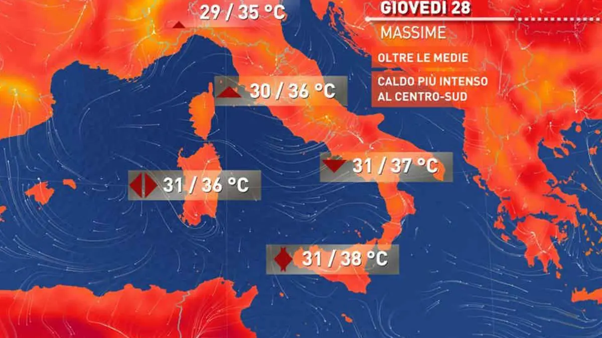 Il fine settimana si prospetta nel complesso soleggiato da Nord a Sud con al più un po’ di instabilità pomeridiana nelle aree interne centro-meridionali. Tra domenica e lunedì caldo in attenuazione al Centro-Sud. Oggi la giornata sarà prevalentemente soleggiata. Al mattino un po’ di nubi in transito al Nord, specie sulle Alpi e qualche annuvolamento sparso sul basso Tirreno. Nel pomeriggio temporali sparsi, localmente intensi, in sviluppo su Alpi, Appennino emiliano e in forma più isolata lungo l’Appennino centro-meridionale. In serata ancora instabile in Piemonte e Alpi centro-orientali. Temperature massime in lieve rialzo al Centro-Nord, in lieve calo su Calabria e Sicilia; nell’Isola si toccheranno i 37-38 gradi. Venti generalmente deboli.