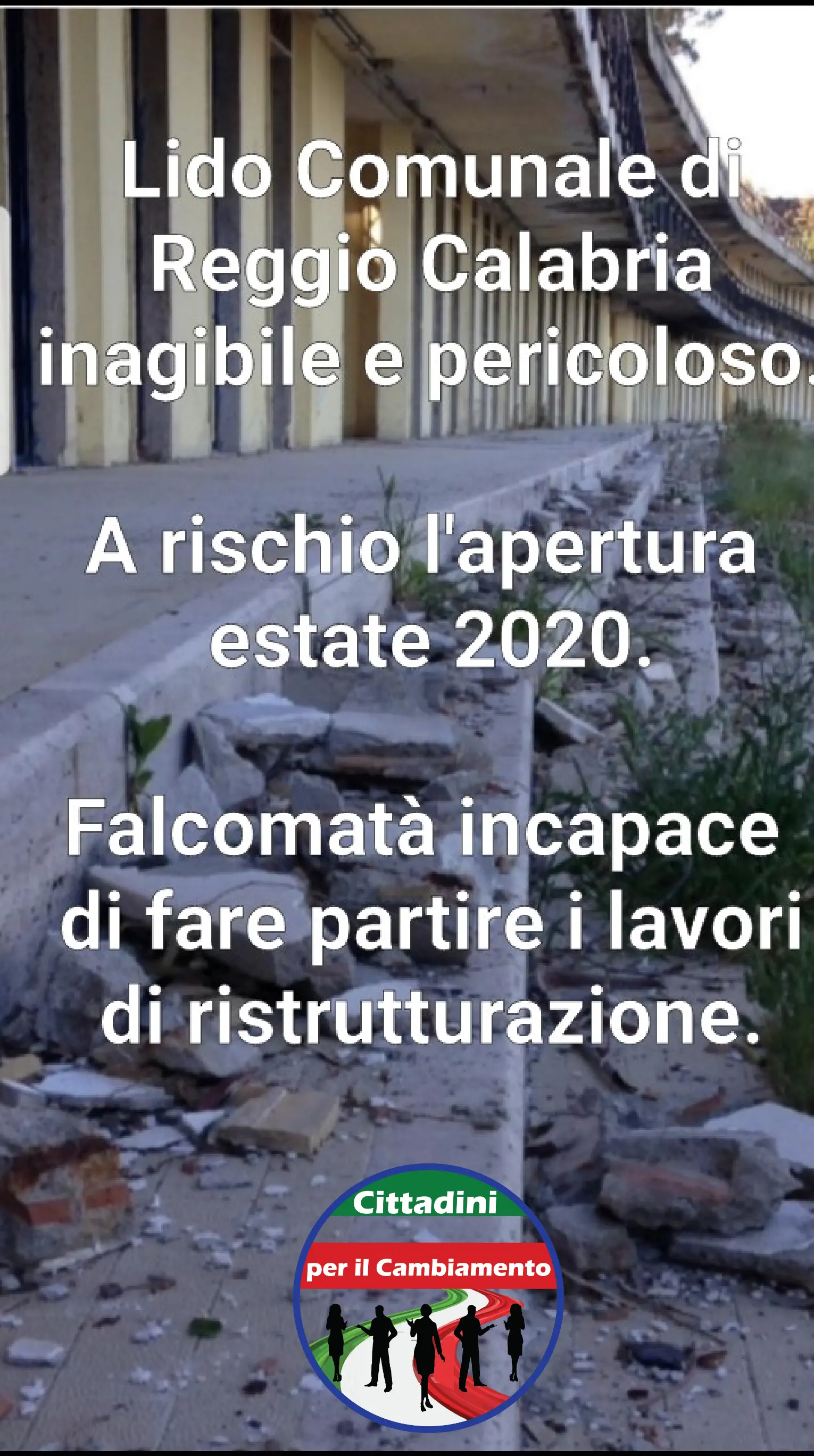 Il lido comunale, importante risorsa per rilanciare il turismo in città, giace in uno stato di evidente abbandono ed i lavori di ristrutturazione, annunciati come imminenti dal primo cittadino lo scorso mese di ottobre, incomprensibilmente son stati fatti slittare al mese di gennaio di quest’anno. Siamo a febbraio inoltrato e dell’apertura del cantiere non vi è alcuna traccia. Poiché i tempi per realizzare il progetto elaborato dall’Amministrazione Comunale sono piuttosto lunghi, la nostra preoccupazione è quella che il lido comunale quest’anno, essendo inagibile, non potrà essere aperto ed i reggini, durante la stagione estiva, dovranno orientare la loro scelta verso altre spiagge e altre strutture balneari.