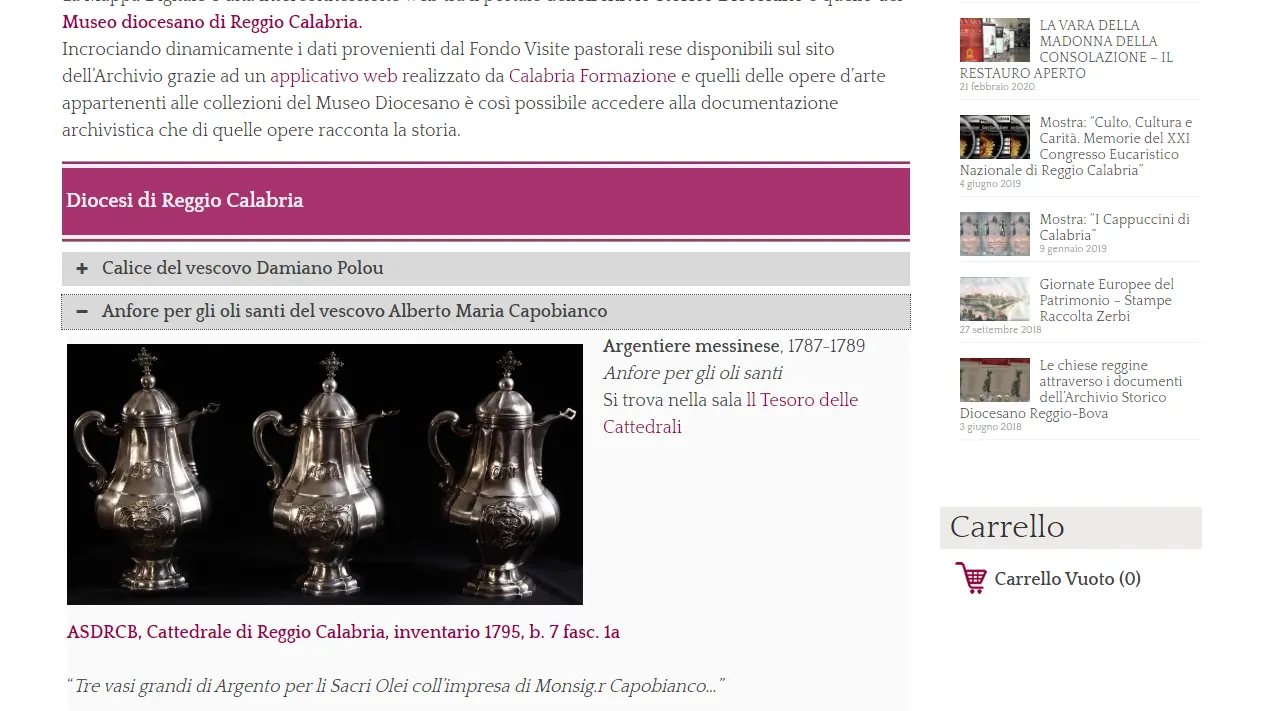 Il progetto “La Memoria ritrovata. Le carte d’Archivio dialogano con l’arte sacra”, finanziato dalla Regione Calabria (P.A.C. 2014/2020 Azione 6.7.1 “Interventi per la tutela, la valorizzazione e la messa in rete del patrimonio culturale, materiale e immateriale”) contribuisce alla valorizzazione e tutela del patrimonio documentario e storico-artistico dell’Arcidiocesi di Reggio Calabria- Bova, attivando nuove e inedite modalità di fruizione dello stesso. La pubblicazione online delle visite pastorali, degli inventari parrocchiali e la mappatura digitale arricchiscono, infatti, la conoscenza dei documenti conservati nell’Archivio storico diocesano e delle opere d’arte del Museo diocesano di Reggio Calabria, rendendo possibile la costruzione di itinerari culturali tematici.