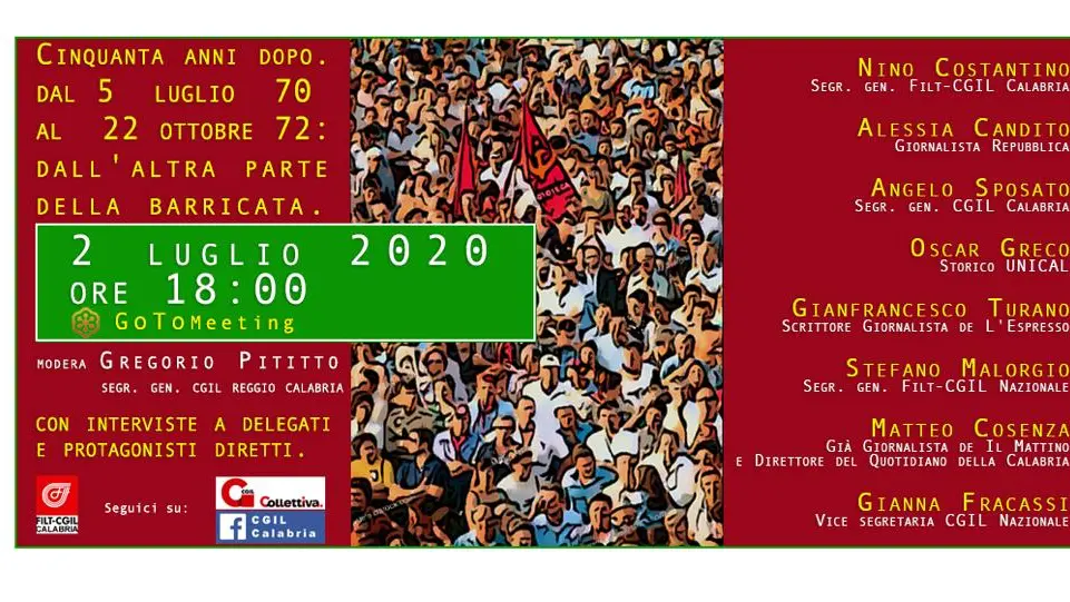 “Cinquant’anni dopo. Dal 5 luglio 70 al 22 ottobre 1972: dall’altra parte della barricata” è il tema dell’iniziativa per ricordare il cinquantesimo anniversario della rivolta di Reggio Calabria. L’incontro, organizzato dalla Filt-Cgil Calabria, si terrà il 2 luglio, a partire dalle 18, sulla piattaforma GoToMeeting ed in diretta sulle pagine Facebook della Filt-Cgil Nazionale, della Cgil Calabria e su Collettiva.it.