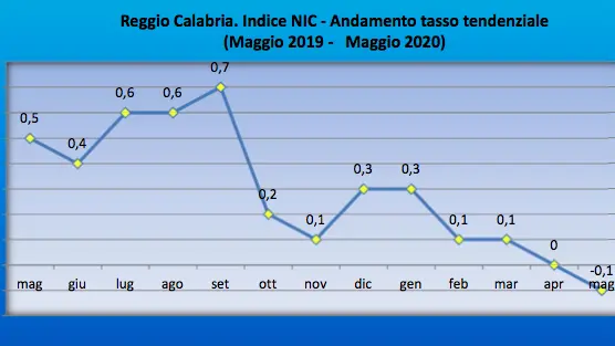 Nel mese di Maggio l’Indice dei Prezzi al Consumo per l’intera collettività nazionale (NIC) della città di Reggio Calabria, registra una variazione rispetto allo stesso mese dell’anno precedente pari a – 0,1%. La variazione congiunturale, ossia rispetto al mese precedente, è pari a -0,1%.