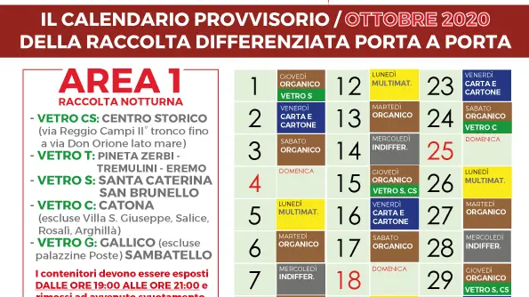 Si avvisa la cittadinanza che sono stati pubblicati i calendari di raccolta differenziata porta a porta, per il mese di Ottobre 2020, per le utenze domestiche del territorio comunale. Dal mese di ottobre, vi sarà una variazione nel giorno di raccolta del vetro, si passerà dal martedì al giovedì per le zone di PINETA ZERBI – TREMULINI – EREMO (VETRO T) e del CENTRO STORICO (Vetro CS).