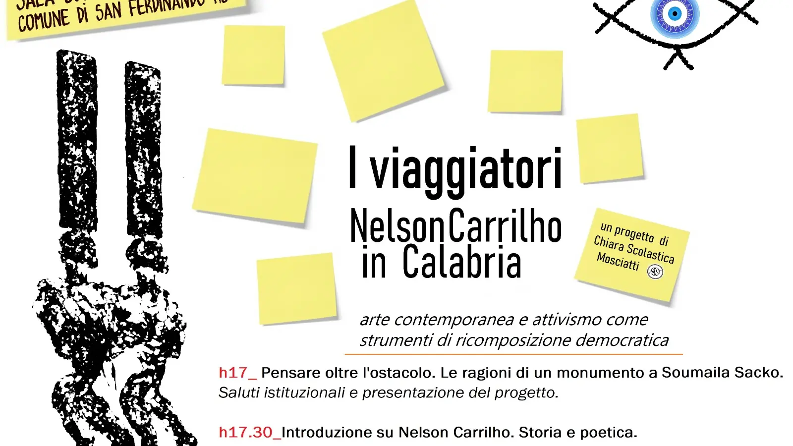 Si parte alle 17 “Pensare oltre l’ostacolo. Le ragioni di un monumento a Soumaila Sacko, con i saluti istituzionali e presentazione del progetto. Alle 17.30 l’introduzione su Nelson Carrilho a cura di Chiara Scolastica Mosciatti, artista e attivista, curatrice di progetto.