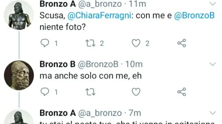 Così anche i popolari account parodia dei bronzi di Riace hanno inteso cogliere la palla al balzo invitando l’influencer milanese a scendere in riva allo Stretto per ammirare le sculture custodite al museo di Reggio Calabria. «Scusa Chiara, con me e il bronzo B niente foto?» si chiede il bronzo A. «Ma anche solo con me» ha replicato il bronzo B. Chissà se la Ferragni, tra un shooting e un altro, troverà il tempo di scendere in Calabria per un selfie con i due guerrieri simbolo di Reggio…