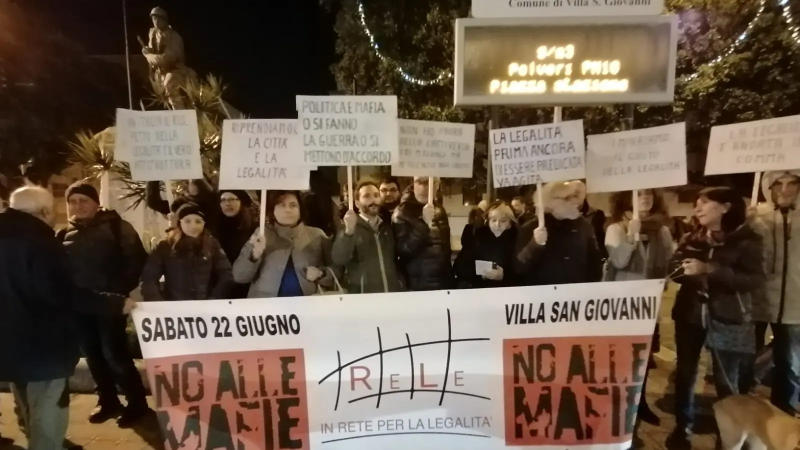 Probabilmente non è il numero che si aspettavano alla vigilia di questa manifestazione. Rete per la Legalità, infatti, riesce a portare in piazza a Villa San Giovanni una quarantina di persone al sit-in che si è tenuto pochi minuti fa davanti alla sede del Comune villese, dove, in questi minuti sta prendendo il via il Consiglio. Una protesta che aveva visto non poche polemiche per via di alcune sigle della rete che non avevano dato la loro adesione alla manifestazione. «Riprendiamoci la città e la legalità», questo uno dei cartelli esposti. «Impariamo il gusto della legalità», recita un altro cartello. Un altro cittadino presente ha esposto un messaggio più diretto: «La legalità prima ancora di essere predicata va agita». Ed ancora: «Politica e mafia o si fanno la guerra o si mettono d’accordo».
