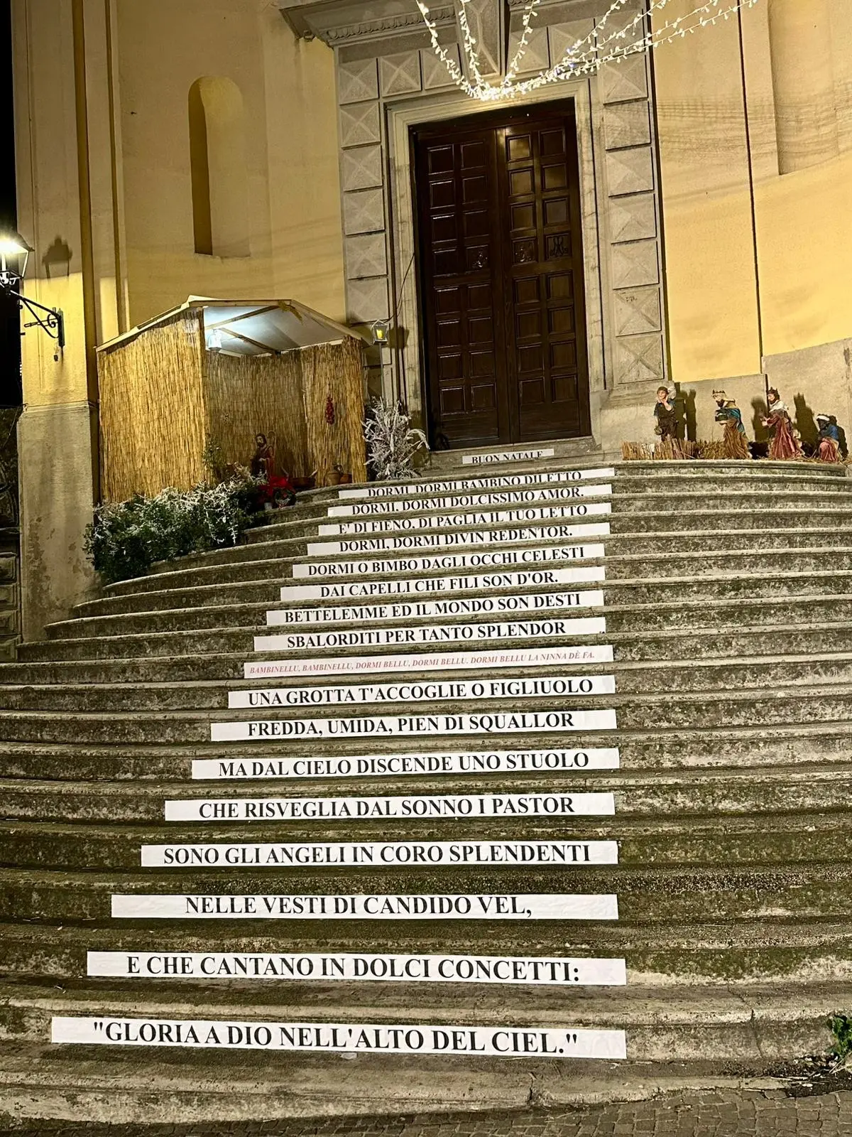 “Dormi, dormi Bambino diletto, dormi, dormi dolcissimo amor. È di fieno, di paglia il tuo letto: dormi, dormi divin Redentor. Dormi o bimbo dagli occhi celesti dai capelli che fili son d'or... Betlemme ed il mondo son desti sbalorditi per tanto splendor”.