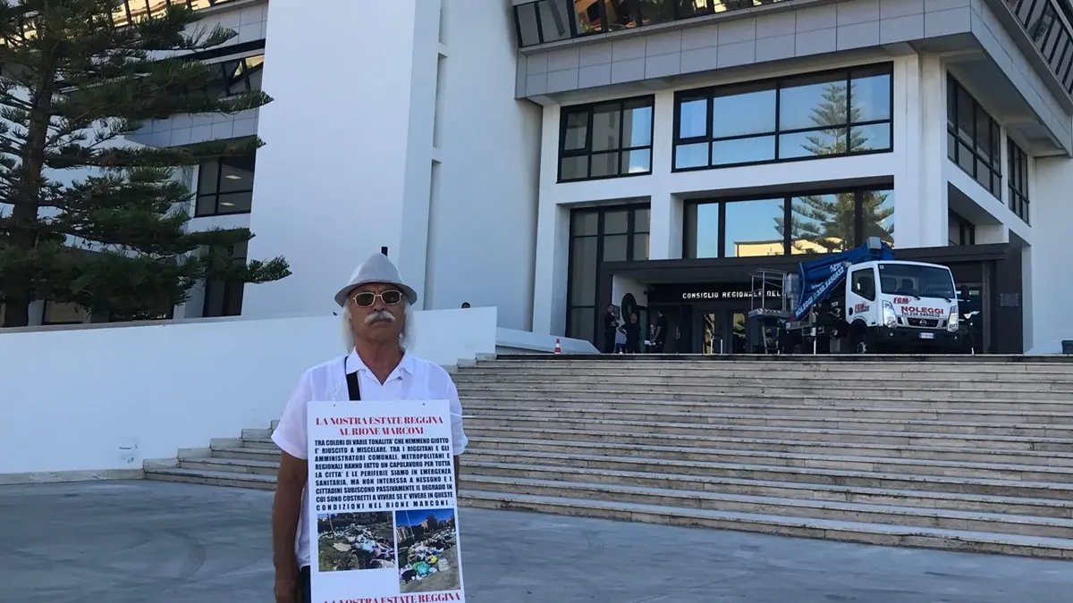 Non si arrende Giuseppe Crucitti che dopo anni di denunce a tutti i livelli e interlocuzioni, ha deciso di intraprendere una serie di proteste davanti ai palazzi Istituzionali. Oggi, in concomitanza con la seduta del Consiglio regionale, la protesta è arrivata davanti a palazzo Campanella. Vive nel tormentato rione Marconi, nella zona sud di Reggio Calabria, flagellato da discariche a cielo aperto e adesso anche da roghi notturni. Vive circondato dal degrado e da illegalità diffusa. Nelle scorse settimane anche la protesta a piazza Italia con la moglie Anna Maria Palermo.