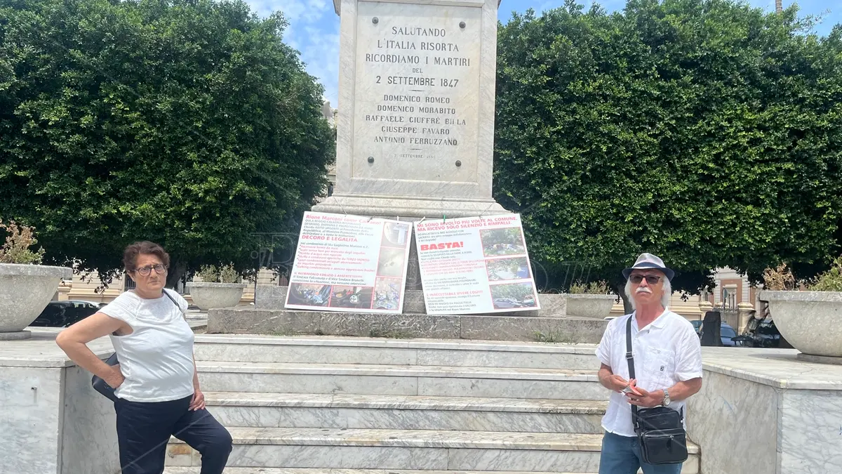 «Ci viene detto che non ci sono novità rispetto alle nostre segnalazioni e alle nostre richieste e intanto la nostra vita prosegue senza tranquillità e in uno stato di esasperazione costante», denunciano nuovamente i coniugi oggi nuovamente a piazza Italia con due cartelloni in cui si invocano rispetto della cittadinanza onesta che popola il rione e il ripristino della legalità.