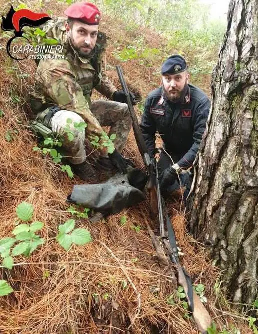 Successivamente, proseguivano il servizio in località “bivio croce di romeo”, frazione Comune di Cardeto ove, all’interno di un terreno, coperto da fogliame, rinvenivano una camera d’aria contenente 1 fucile sovrapposto cal. 12 con matricola abrasa, 1 fucile monocanna cal. 12, 1 fucile a canne parallele cal. 16 privo di marca e matricola, 1 carabina ad aria compressa priva di marca e matricola, 10 proiettili per pistola cal. 7,65, 5 cartucce cal. 12 e 6 cartucce cal. 16 a pallettoni;