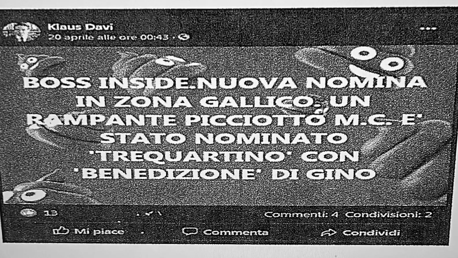 Gli inquirenti partono, infatti, dal ruolo di vertice rimarcando come «Quanto accaduto nell’aprile 2020 è, sul punto, assolutamente eloquente. Il 20 ed il 22 aprile 2020, infatti, il giornalista Klaus Davi pubblicava sulla propria pagina Facebook due post. Entrambi contenenti alcune notizie acquisite circa gli assetti della ndrangheta locale.