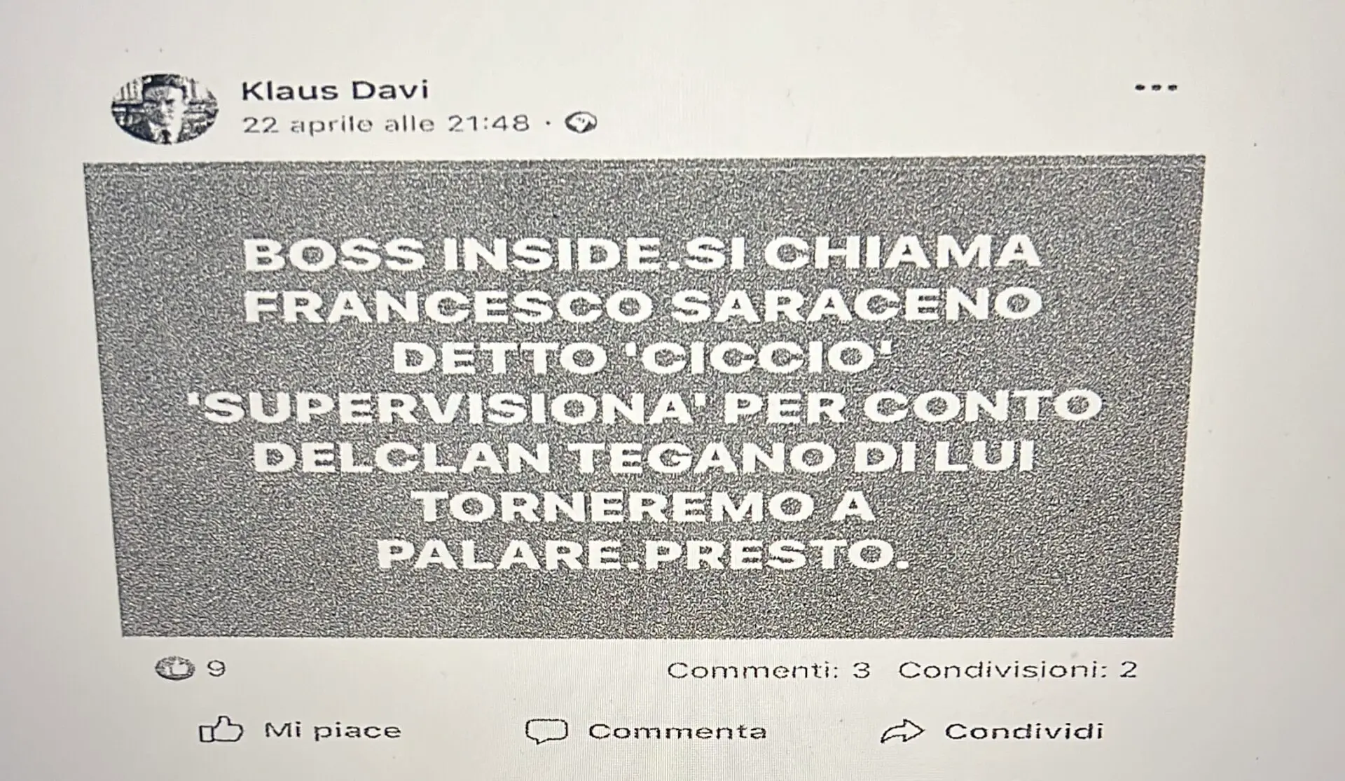Idotta segnalava a Perla che, dopo il primo post, ne era stato pubblicato uno ulteriore, riguardante Francesco Saraceno, di cui gli dava lettura. «I due concordavano sui gravi rischi giudiziari corsi da quest’ultimo e sull’opportunità di informarlo [IDOTTA: Questa è qualche altra cosa che ha scritto: “Boss inside. Si chiama Francesco Saraceno detto Ciccio... questo qua pure…di Ciccio… questo non l’avevo visto…detto Ciccio. Supervisiona per conto del clan Tegano. Torneremo a parlare presto” PERLA M.: Lo arrestano. IDOTTA Antonino: A Ciccio, sicuro. Non l’ho visto ancora per farglielo vedere. PERLA M.: Si perché loro non lo sanno”]».