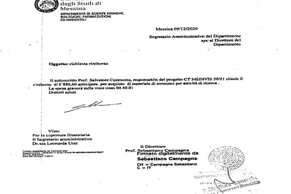 Un altro ha spiegato di non sapere «che il professore Cuzzocrea presentasse richieste di rimborso a nome mio. Solitamente, ci rivolgevamo a lui quando mancava qualcosa in laboratorio, e sapevo che lui anticipasse le spese per l’acquisto del materiale di consumo. Pertanto — ha aggiunto — quando mi venivano accreditate sul conto corrente personale le somme da parte dell’università, io procedevo immediatamente a rigirarle al professore Cuzzocrea, pensando che si trattasse di rimborsi per spese da lui sostenute per l’acquisto di materiale da laboratorio che, di volta in volta, gli chiedevamo di acquistare. Pensavo fosse una procedura regolare, trattandosi comunque di soldi tracciabili e accreditati sul conto corrente da parte dell’università di Messina, procedura tra l’altro avallata anche dagli uffici amministrativi».