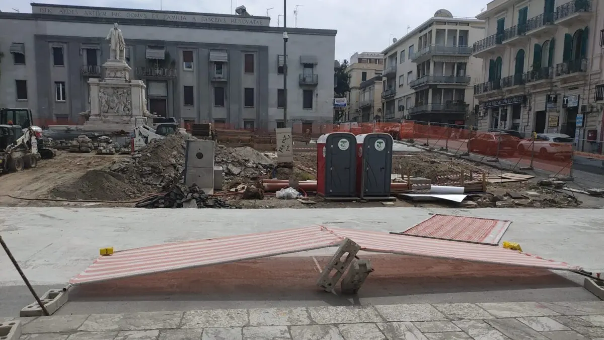 È la seconda volta che succede, per fortuna, nel caso odierno, si è trattato solo di una parte del recinto. A maggio le cose erano andate diversamente. Il vento aveva fatto cadere le pesanti recinzioni che chiudevano alla vista il cantiere, rendendolo bunker misterioso, proprio nel momento in cui incalzava la polemica per l’inizio dei lavori di restyling della piazza.