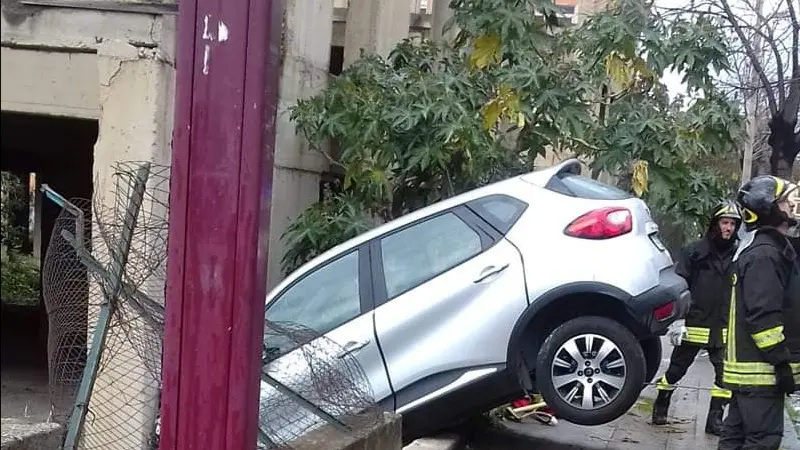 Sul posto sono intervenuti i vigili del fuoco del vicino comando provinciale che hanno provveduto a prestare i primi soccorsi ed a recuperare l’auto rimasta incastrata nello scalone fra il marciapiedi ed il palazzo.