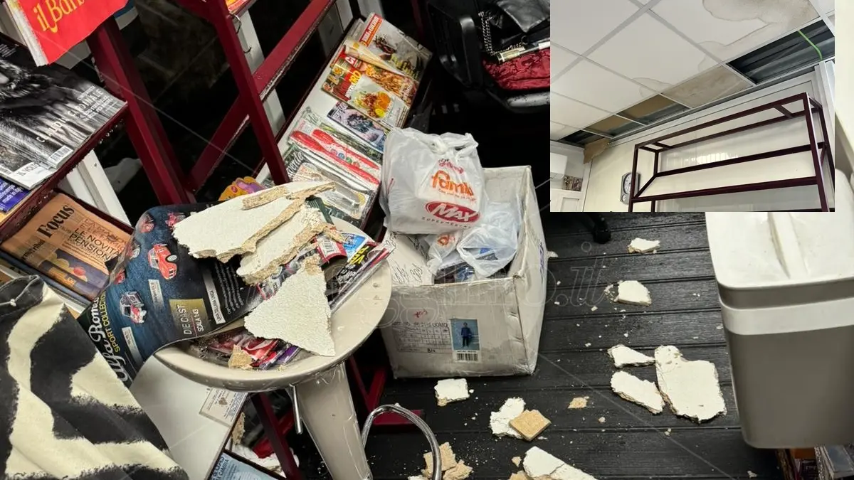 Dopo la segnalazione al Comune di sabato mattina, all’indomani della pioggia battente, e le sollecitazioni di ieri, oggi i gestori dell’edicola sono stati rassicurati da vicina prospettiva di intervento. Intervento di cui adesso restano in attesa per lavorare in sicurezza e prevenire altri danni. Un angolo di soffitto, già compromesso dalle prime piogge autunnali che lo scorso ottobre avevano fatto venire giù due pannelli, presenta un allargamento dell’area raggiunta dall’acqua. I pannelli venuti giù sono diventati quattro, di cui uno prossimo a sbriciolarsi sulla testa dei gestori.